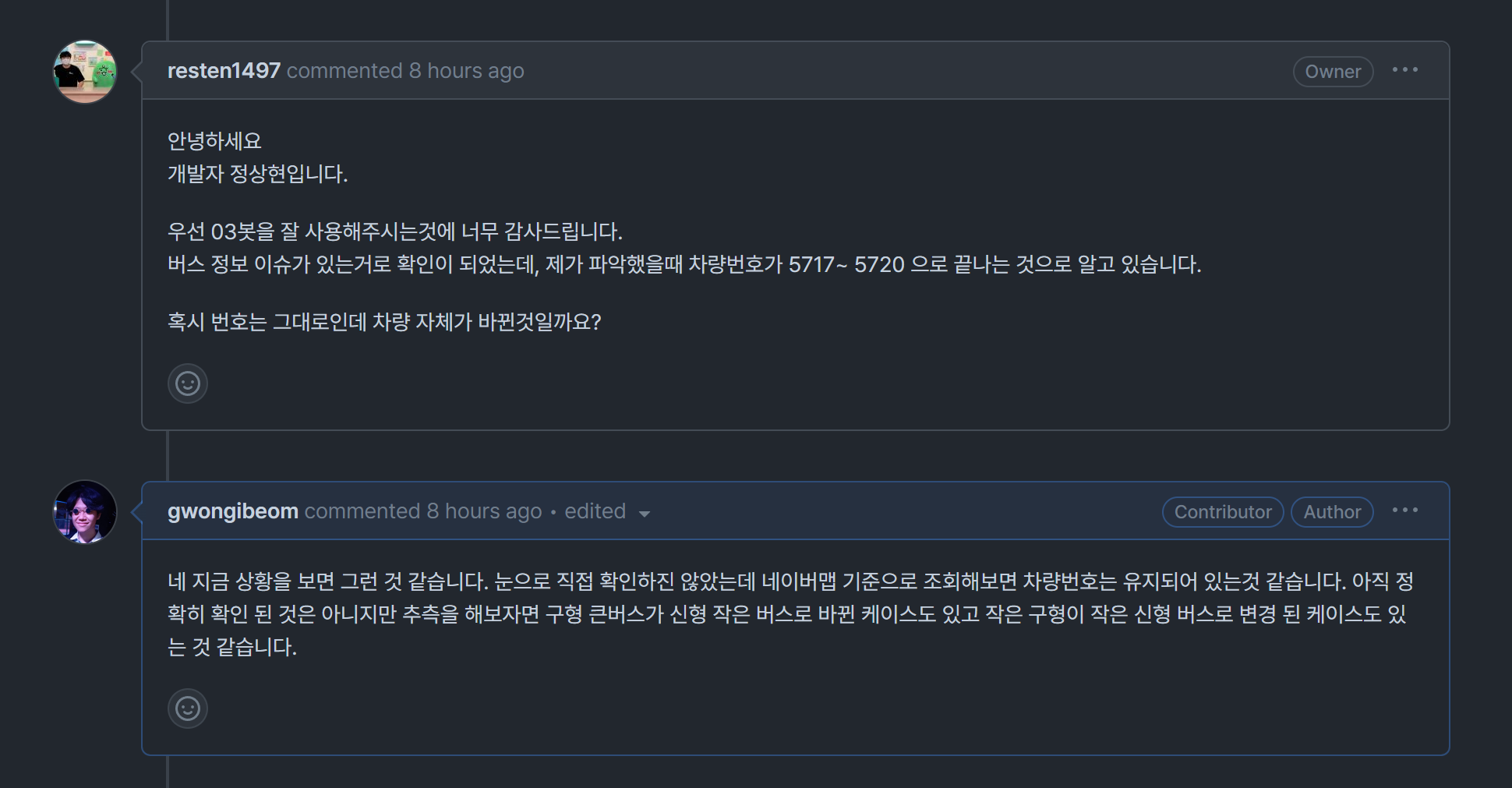 우선 메인테이너님이 확인한 이슈 상황 통해 문제점을 자세하게 듣고 추가적으로 상황을 설명하였다. 이를통해 문제현황을 정확히 파악하였다.