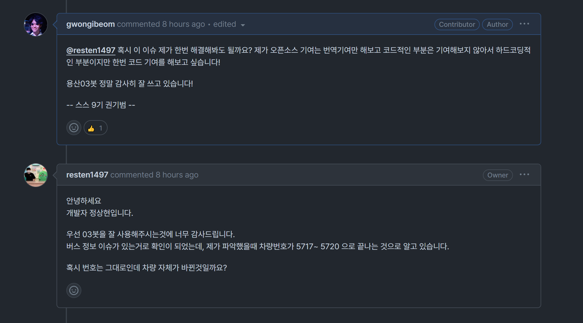 마지막으로 나의 첫 코드기여를 도와주신 개발자 정상현 a.k.a Resten1497 선배님에게 감사를 표한다.