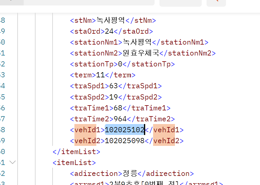 기존코드를 문제가 됐던 75사5720 버스의 고유번호인 102025102가 BigSize 배열에 있는 걸 알 수 있다.